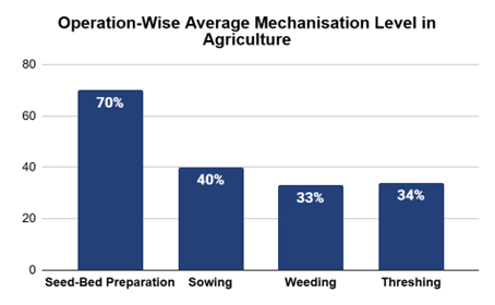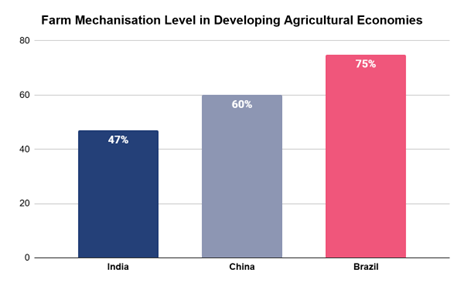 - Although the use of proper equipment can increase farm productivity by up to 30% and reduce costs by about 20%, India’s overall farm mechanisation level stands at around 47%.