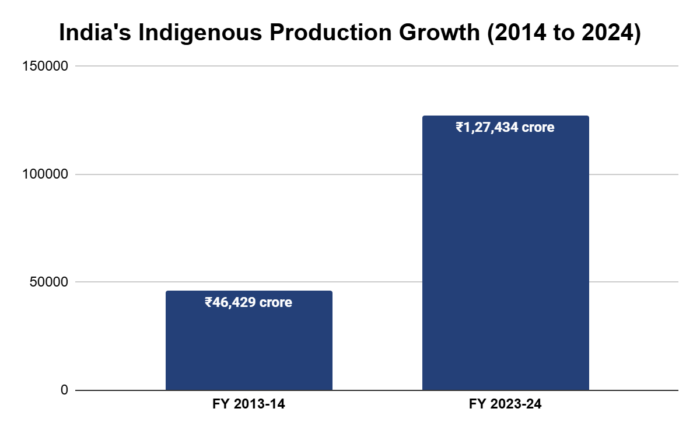 India recorded its highest-ever defence production of ₹1.54 lakh crore in FY 2024–25, while defence exports rose to a record ₹23,622 crore in the same year. This recent momentum builds on a much larger structural shift. Indigenous defence production reached ₹1,27,434 crore in FY 2023–24, marking a 174% rise from ₹46,429 crore in 2014–15. The government is further targeting ₹3 lakh crore in defence production and ₹50,000 crore in defence exports by 2029., The ₹7.85 lakh crore allocation to the Ministry of Defence in the Union Budget 2026–27 adds further weight to domestic procurement, research, and indigenisation1