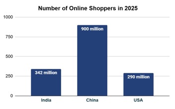 India has surpassed the United States (320 million) to become the world’s second-largest e-retail market, with an estimated 342 million online shoppers in 2025. Globally, the country now ranks second, behind China (900 million)[3]. This scale of domestic consumption creates significant depth for retail categories while also building the foundation for outward expansion.