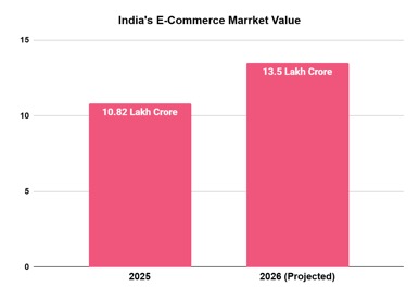 India’s e-commerce sector has recorded a gross merchandise value (GMV) of approximately ₹1.19 lakh crore, reflecting a 12% year-on-year growth. The market size has already reached ₹10.82 lakh crore and is projected to expand at a 27% CAGR, reaching ₹13.5 lakh crore by 2026[1]. This growth is supported by deeper digital adoption and changing consumer behaviour across income segments and geographies[2].