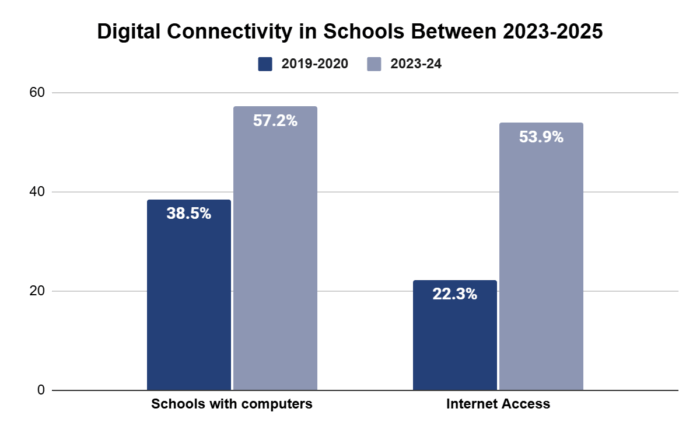 - Digital Connectivity: The percentage of schools with computers is 57.2% in 2023–24 (up from 38.5% in 2019–20), and the percentage with internet access is 53.9% (from 22.3%) during the same period. Despite the increase, a large proportion of schools still cannot fully tap into e-learning, remote classes, or digital resources2.