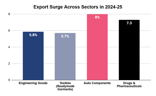 Sectoral indicators also show movement in industries where MSMEs form a large part of the supply chain. For instance, engineering goods grew by around 5.86% year-on-year during the April–August 2025 period, readymade garments in textiles were up by 5.78%, and drugs and pharmaceuticals by 7.30%. This reflects steady demand across key markets and consistent activity in sectors where MSMEs contribute significantly through manufacturing, fabrication, packaging, logistics, and contract services.
