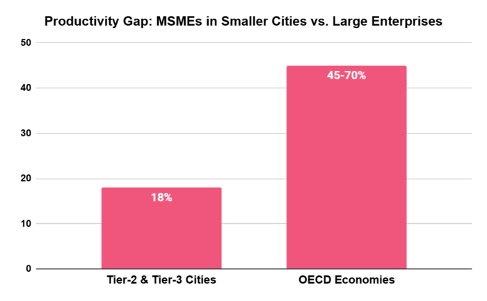 Tier-2 and Tier-3 cities account for more than 51% of India’s registered MSMEs1. However, the growth potential of these enterprises remains constrained. MSMEs in smaller cities operate at only around 18% of the productivity of large enterprises, far below the 45–70% range seen in the OECD (Organization for Economic Co-operation and Development) economies2. This productivity gap is shaped by three major challenges: credit deficit of ₹30 lakh crore, only 18% adoption of digital lending platforms, which limits MSMEs’ ability to access faster, data-driven financing,3 and infrastructure gap, without which MSMEs in Tier 2 and Tier 3 regions remain unable to build the scale required for sustained competitiveness.