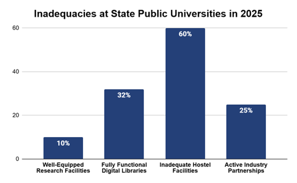 The status of colleges is similar. For instance, roughly 40% of faculty posts at State Public Universities (SPUs) are vacant. Furthermore, only 10% of these have well-equipped research facilities, and just 32% have fully functional digital libraries. More than 60% lack adequate hostel and accommodation capacity, limiting access for students from rural areas. Fewer than 25% maintain active industry partnerships for research or employability training, while funding delays and public spending below the 6%-of-GDP benchmark weaken research and hiring3.