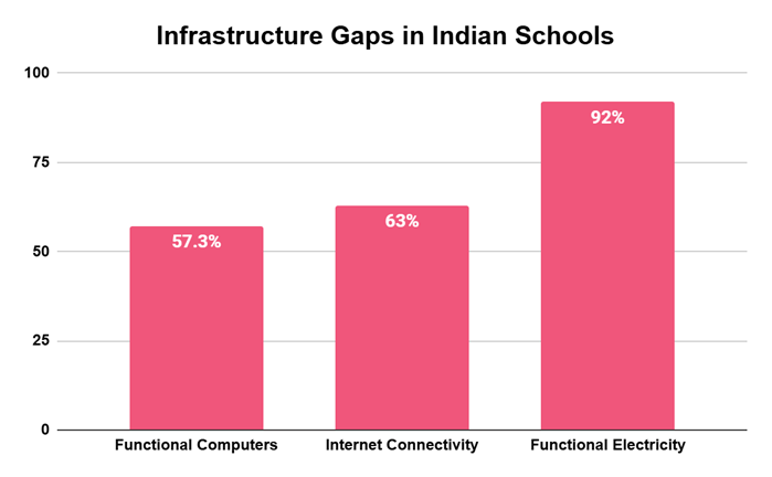 - India’s schools and colleges face major infrastructure gaps—over 1.5 lakh schools lack electricity, less than 60% have computers or internet access, and colleges struggle with vacant faculty posts, weak research capacity, and limited digital libraries.